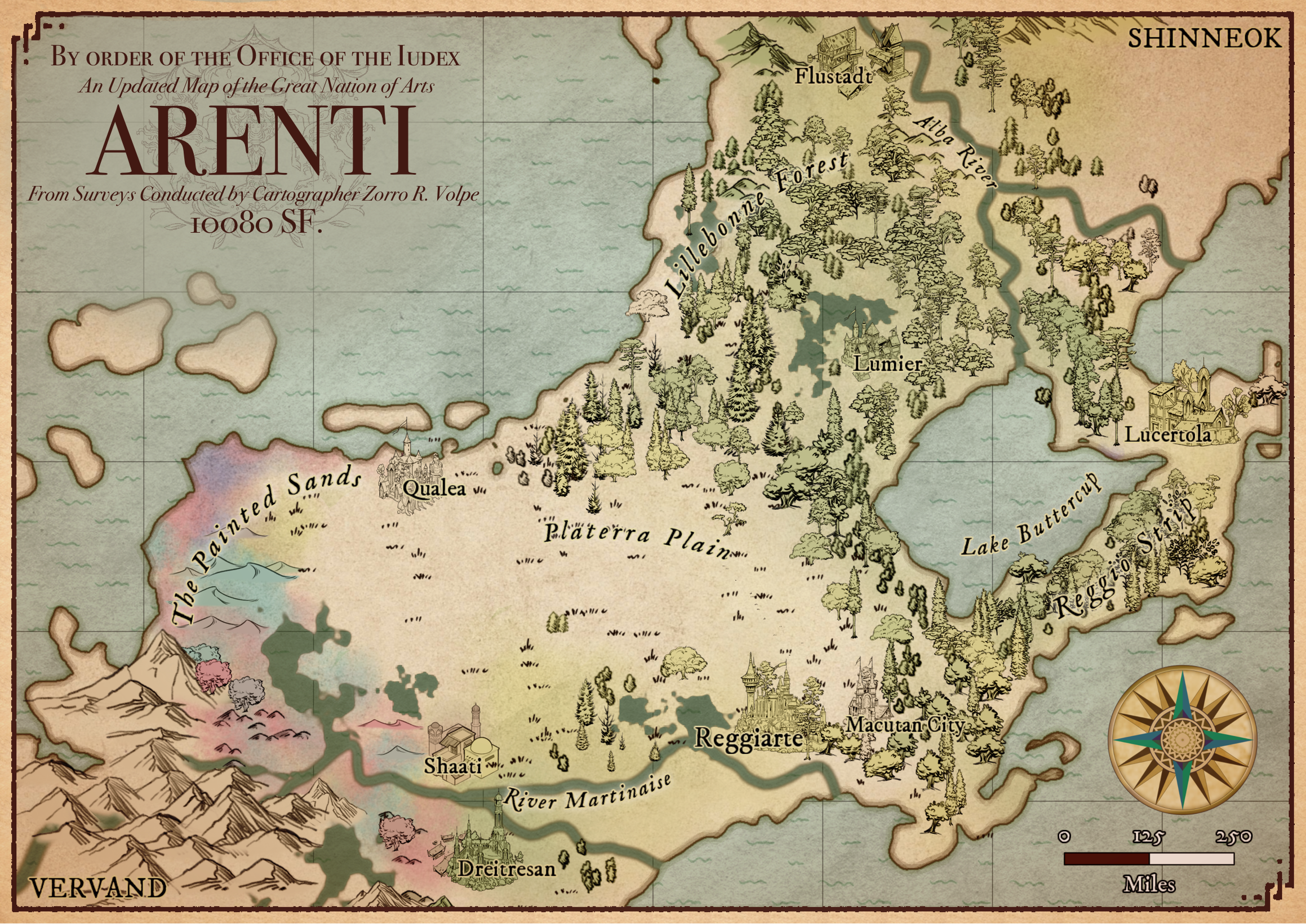 Just northeast of Vervand, past the Crideann Mountains, is the land of Arenti, known far and wide for its art and culture. The land of Arenti itself is partly arid where it lies in the rain shadow of the mountains, part rolling, wind-blown plains, and part lush temperate forest. The massive Lake Buttercup is located on the eastern coast of Arenti, around which are a multitude of settlements.