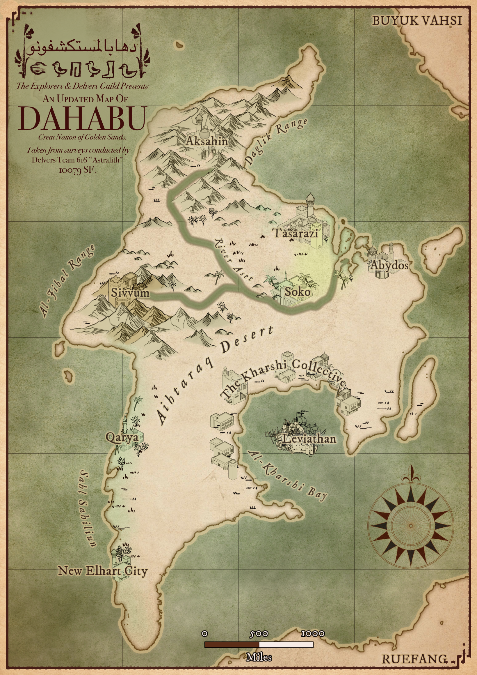 The majority of Dahabu is part of the Aihtaraq Desert, an unending sea of vast sand dunes. The majority of Golden Age ruins are located here, yet to be uncovered. In the north is the Crescent of Aset, a fertile oasis in the otherwise hostile climate and home to several city-states, as well as the Twin Ranges region, where an abundance of natural resources is found. In the southeast is the Al-Kharshi Bay, Dahabu's gate to the outside world. It has become a popular destination for Ruefang researchers to visit, stock up, and hire guides and protection before conducting research in the ruins of Dahabu.