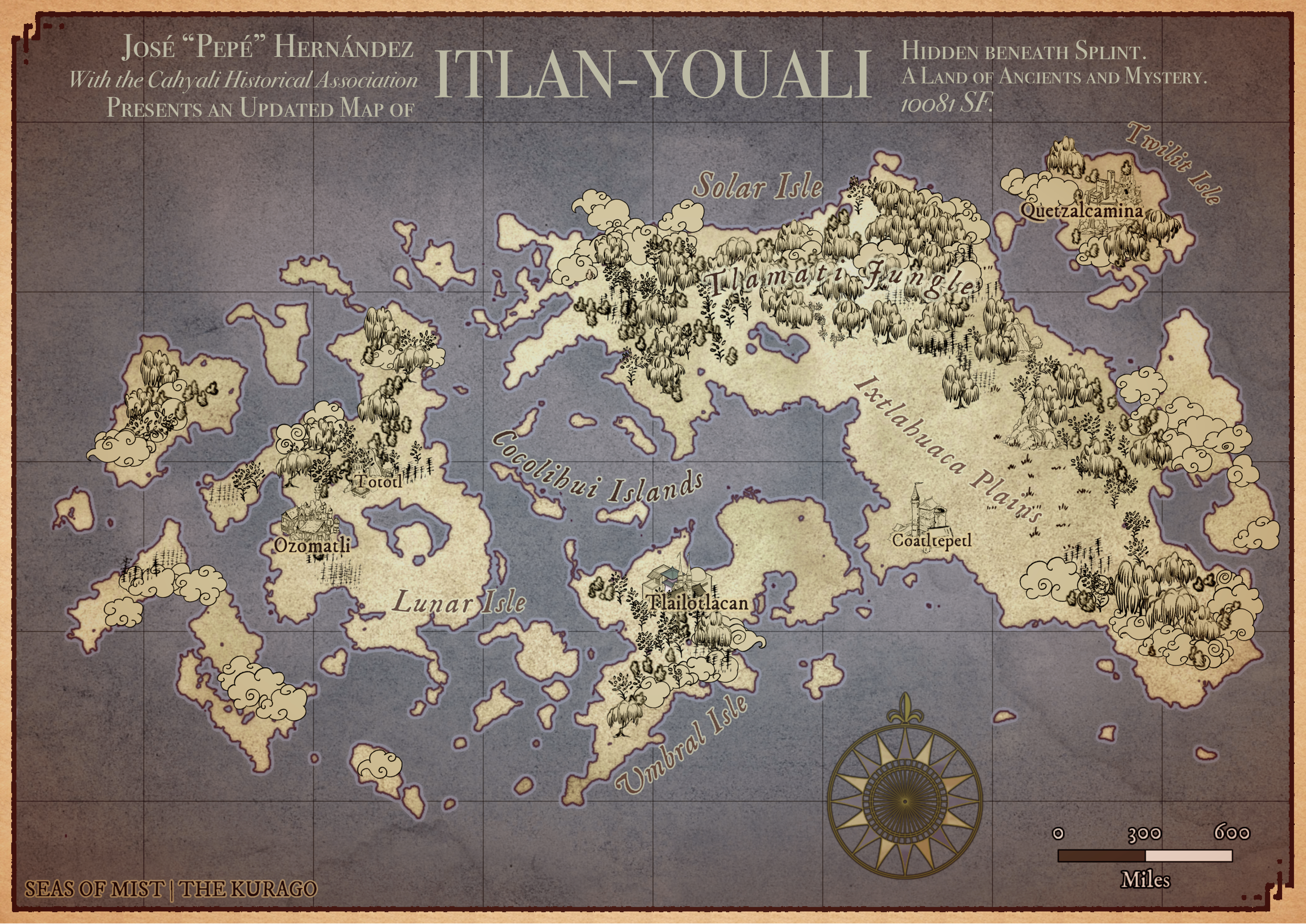 Scattered across Splint are pools within sinkholes, known as cenotes. At the right time, and with a little luck, leaping into one of these cenotes will lead one to the vast underground realm of Itlan-Youali. One might expect these caverns to be desolate and dark, like most caves, but Itlan-Youali is anything but. Veins of gold-obsidian carved into intricate shapes deliver light below like several small suns, supporting a lush tropical landscape. The islands of Itlan-Youali float, magically suspended in a thick mist. Some believe that this mist leads to the Kurago, or perhaps the Dreaming. Accounts from those that have descended and survived are discombobulated and confused. The inhabitants of Itlan-Youali are the Tonameyoti Atlaca people, also known as the Tonatiu or, informally, the Tlaca.