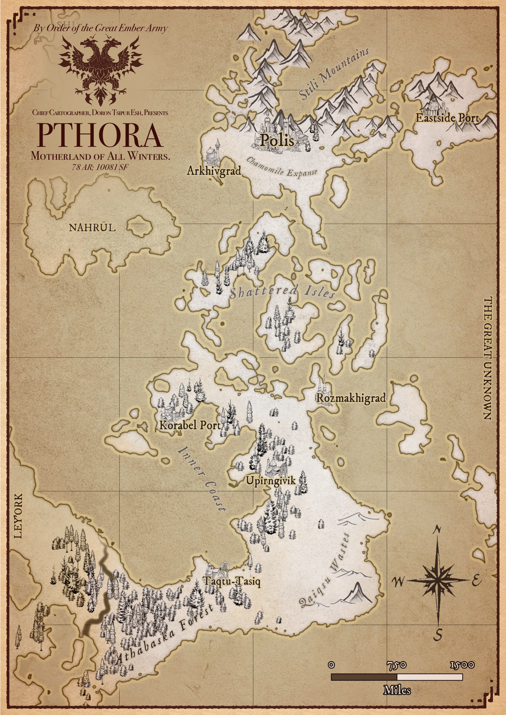 Pthora is a large country, though most of it is centralized in the northern landmass and archipelago. Southern Pthora is hardly Pthora at all, though Polis still claims dominion over the vast, forbidding tundras. Altogether, the country is broadly split into six regions.