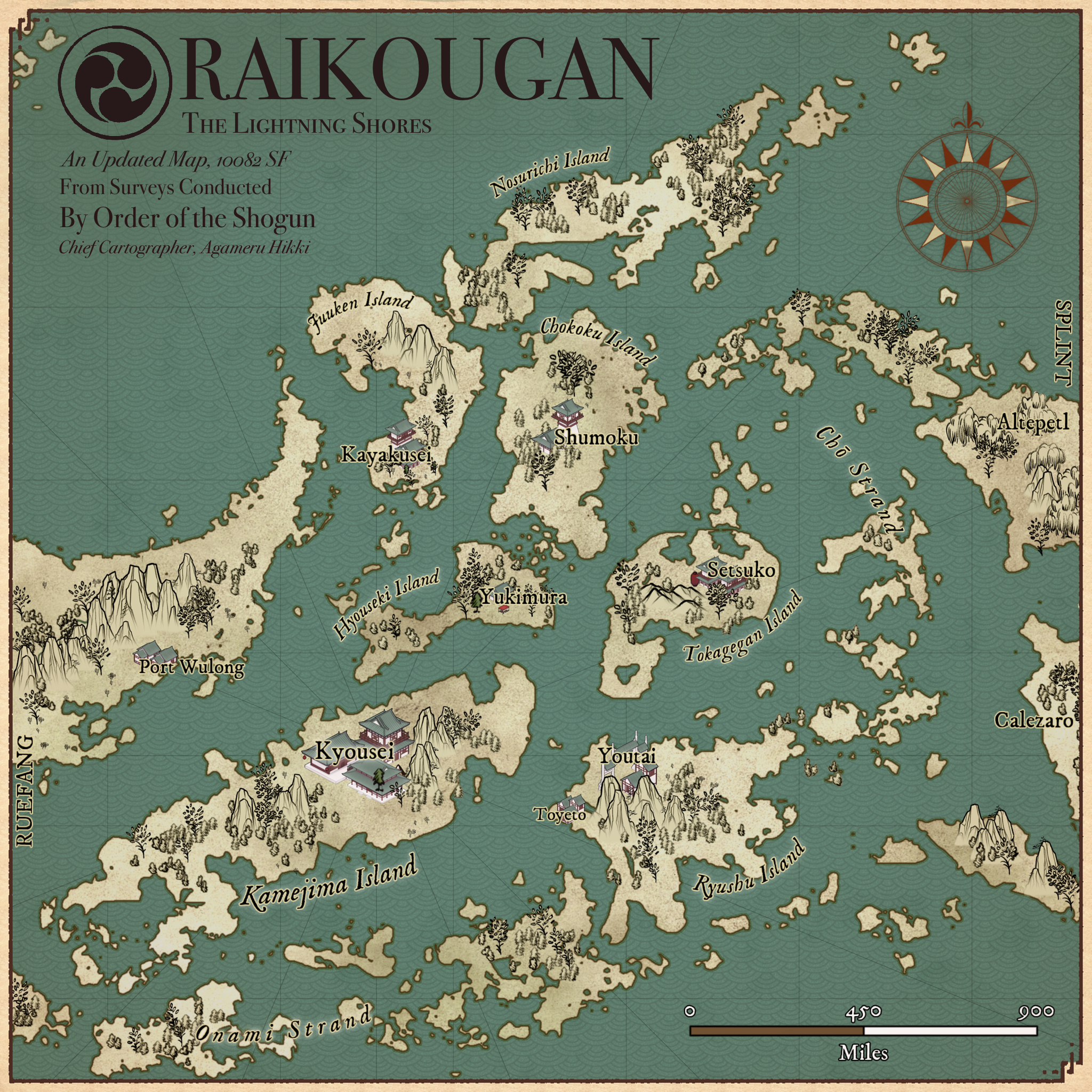 Kyousei, Seat of the Shogun: The capital of the Raikougan Archipelago, and one of the most populous cities in the nation. Situated closest to continental Ruefang of all major Raikougan cities, Kyousei boasts prosperous trade and notable industrial advancement. Despite this, the architecture retains a traditional, indubitably Raikoujin flair.