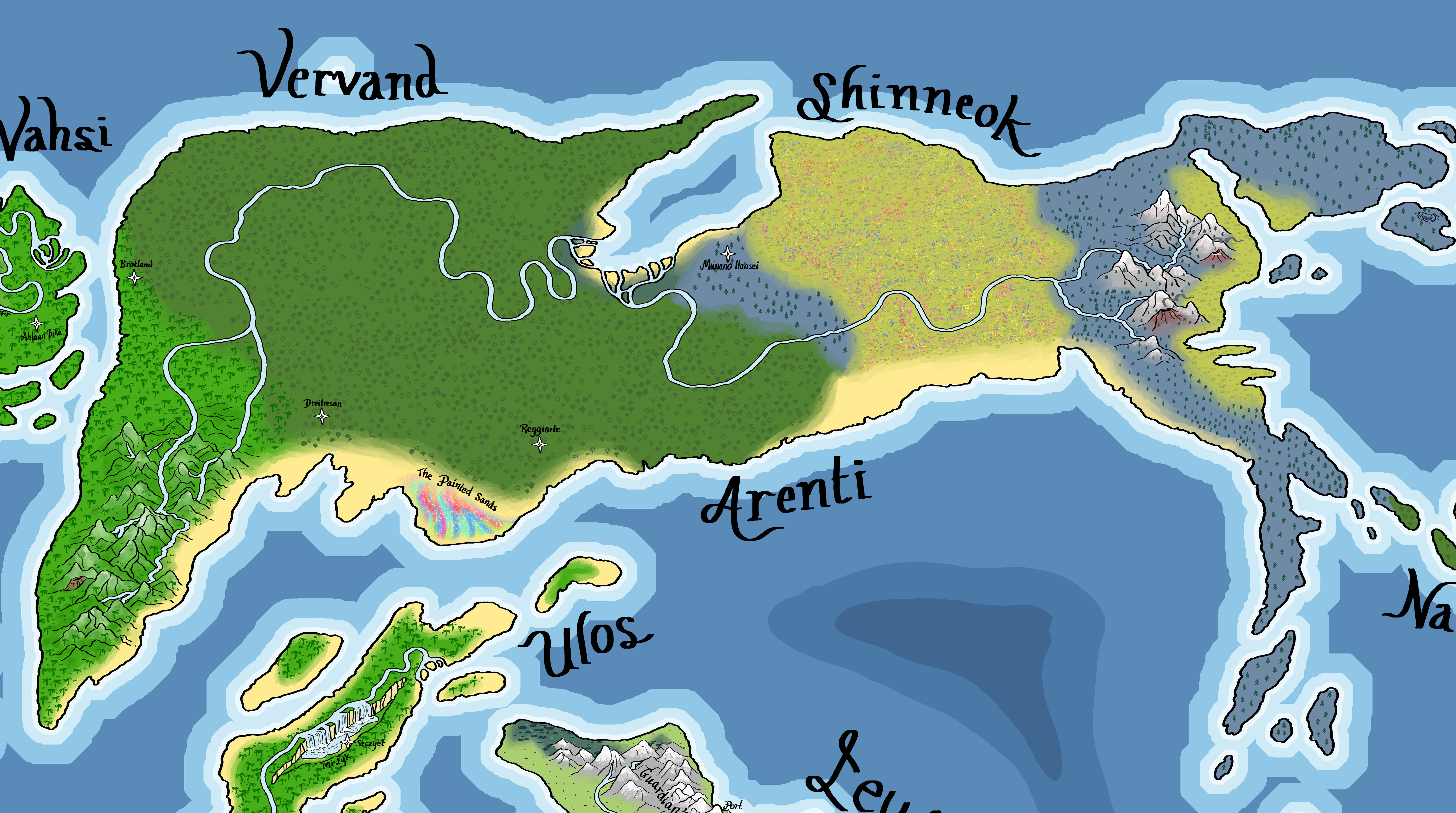 Shinneok features both a flat rolling shrubland, and an expansive tiaga. The Sukēromauntain lines the far eastern border, a mountain range where dragons were rumored to live). Near the capital of Mūnano Hansei is Heiwa, a large botanical garden. The borders between Vervand, Arenti, and Shinneok are incredibly loose, as the countries are very close.