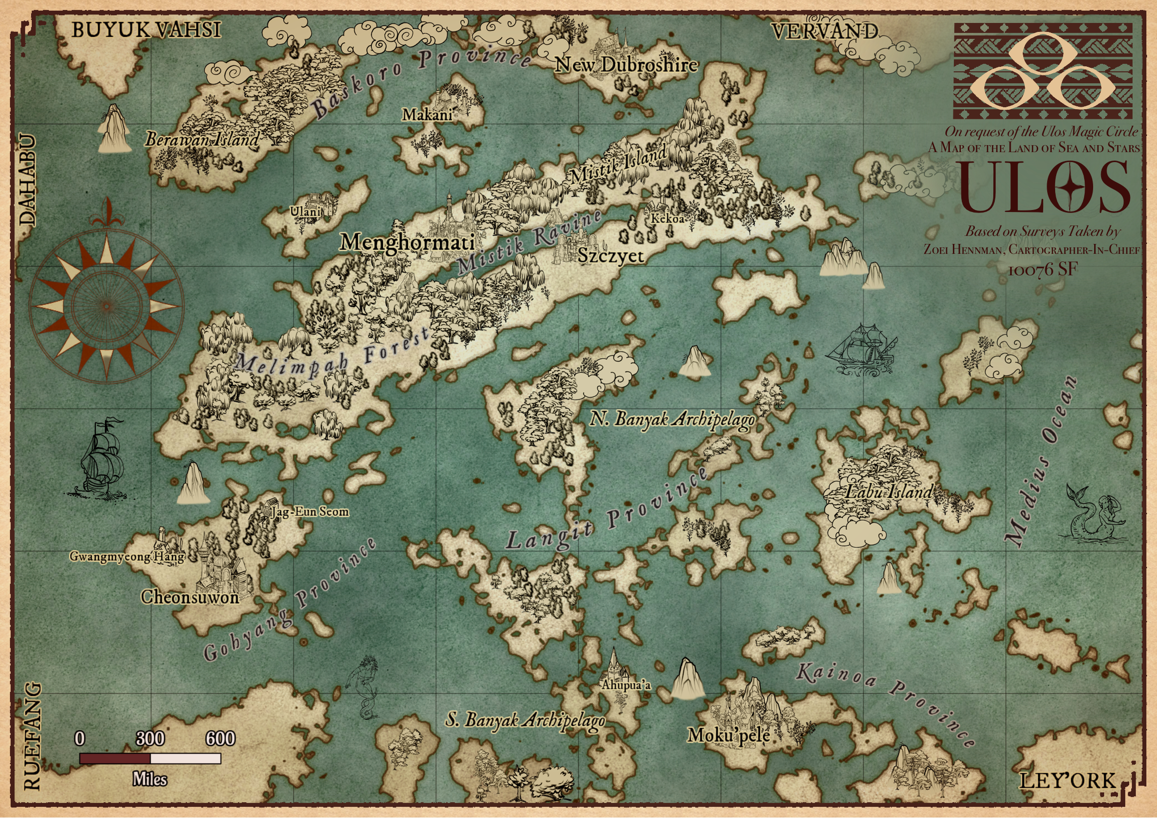 Ulos is an archipelago nation, with a tropical climate and natural beauty known the world over. On its largest island of Mistik is the eponymous Mistik Ravine, with waterfalls stretching for miles. Magic is strong, yet unpredictable within Ulos; perhaps this is because the border between the Mistik Ravine and the Elemental Plane is thin, or perhaps due to strange ore found in the islands' land. Ulos is loosely based on the real-world regions of Indonesia, Polynesia, and Korea.