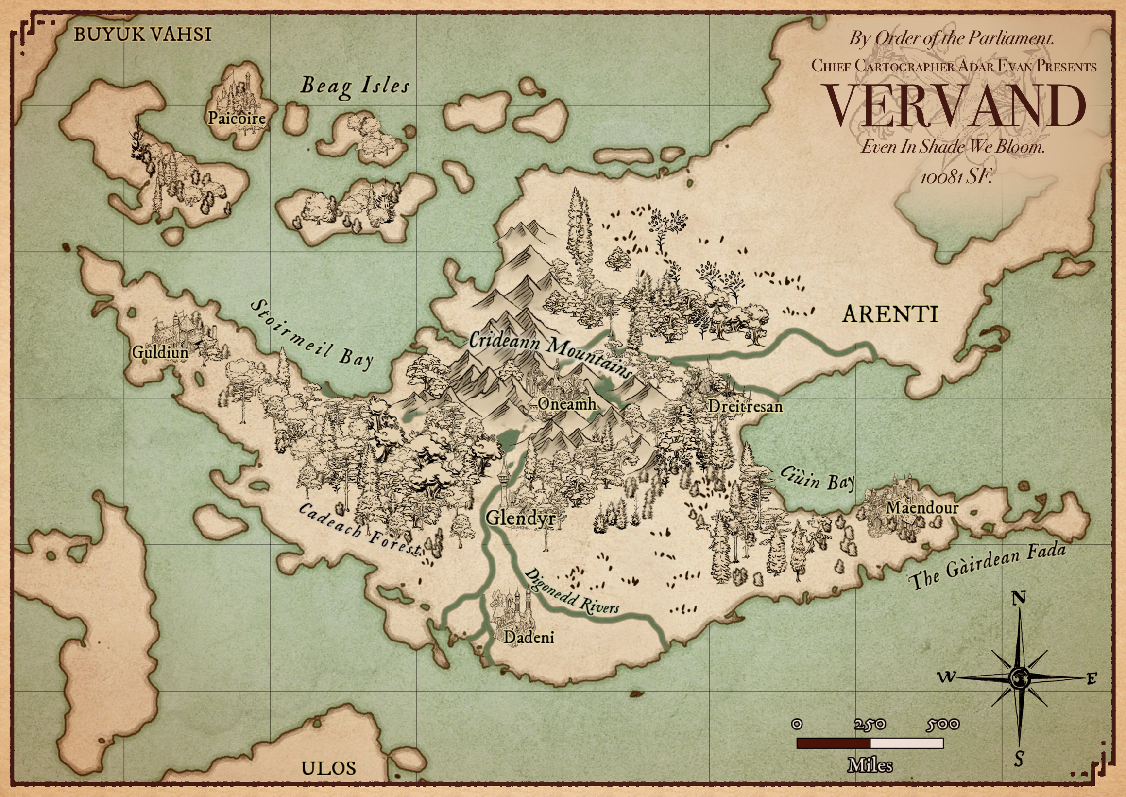 With a name meaning “green,” Vervand is a lush land on the western side of the Oxis Alliance, and often acts as a gate between Western and Eastern Cahyali. Its lands are rolling hills and lush temperate forests, with the ancient Crideann Mountains acting as a border between Vervand and its neighbor of Arenti. Vervand has faced much hardship over the years, from Shinnean occupation to Dahabi rule. However, it is now a thriving nation.