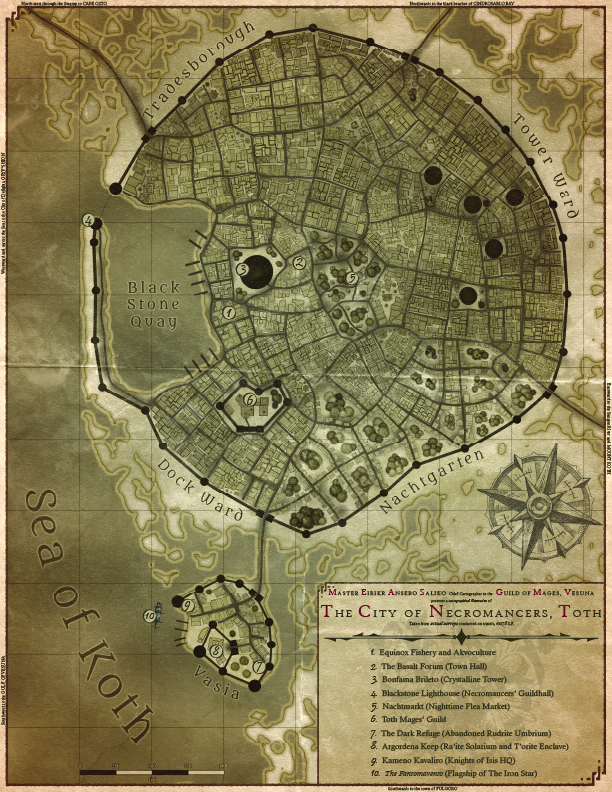 For millennia, Toth has been ruled by a handful of elite families of mages. In particular, the city is dominated by necromancers and, to a lesser extent, other earth mages. Traditional law doesn’t quite apply in Toth, as the entire island is often in chaos due to inter-family conflict, in which the oligarchs vie for power against each other. This has prevented the city from retaking the wilds of Koth, as the families often sabotage each other when they try to rebuild the ruins.