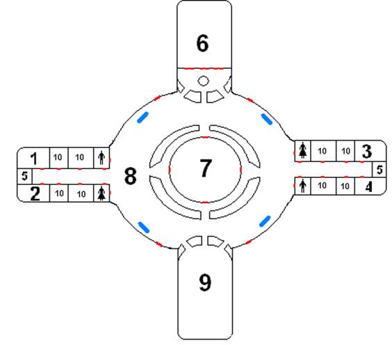 8. Main Dining/Drinking. There are 4 main bars around the pit, fitted with stools for easy viewing. The room also has numerous circular tables for eating and carousing. Each table comes with 4 chairs, condiments, and a set of dice.