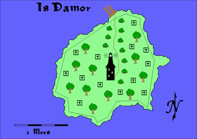 Is'Damor, better knows as the Isle of the Dead, is a small isle slightly south of Centralia City. The most notable feature of Is'Damor is, by far, the mausoleum. The mausoleum, Is'Damor's only permanent structure, was created by Master Telain and was completed in 9856SF. It was to be his life's work and crowning masterpiece, standing seventeen stories tall and crowned by a lighthouse that is, today, maintained by the priesthood of Ra.